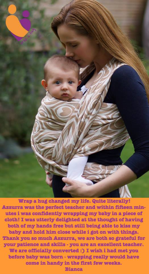 Wrap a hug changed my life. Quite literally! I was a Stokke Xplory pushing mummy who had not even heard of a woven wrap until i met Azzurra. I was struggling to come to terms with how i was going to continue with family weekend walks through Hampstead Heath with my five year old and my new baby. I saw on Facebook an advert for Wrap a Hug and, not knowing anything about baby wearing i went along with my 11 week old baby to find out what a Sling Library was all about. Azzurra was the perfect teacher and within fifteen minutes i was confidently wrapping my baby in a piece of cloth! I was utterly delighted at the thought of having both of my hands free but still being able to kiss my baby and hold him close while i got on with things. I had tried three types of Baby Bjorns which i found very painful on my back and have been collecting dust in my wardrobe. I also have tried the Ergo baby. I admit the Ergo is a lot better than the Baby Bjorns but none of these structured carriers can compare to the comfort and support a woven wrap provides. It’s tailored to your body and the weight is not just resting on your shoulders and hips but spread evenly over your chest and back too so my baby felt so much lighter. I noticed my baby was also happier because with the fabric wrapping us together it felt like a cosy cuddle for both of us. At first glance a woven wrap looks a bit ‘hippy dippy’ and i thought it also looked really complicated to use. It’s actually really easy once you get the hang of it and Azzurra helped me figure out the tricks to getting my baby wrapped quickly and comfortably. I actually have become so into baby wearing that my £1500 stroller is now a decorative item in my house wink emoticon My husband who initially rolled his eyes when i told him about babywearing asks me to wrap our baby on him all the time! Who knew it was so addictive? Thank you so much Azzurra, we are both so grateful for your patience and skills – you are an excellent teacher. We are officially converted smile emoticon I wish i had met you before baby was born – wrapping really would have come in handy in the first few weeks