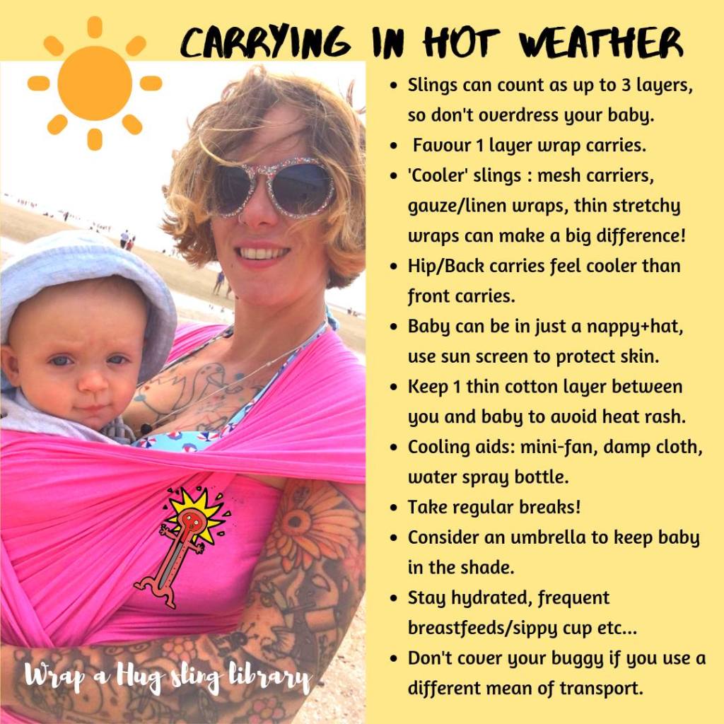 ๐Position: carrying on the hip or on the back (when baby has full head control) is cooler than on the front when the majority of the heat is concentrated.
