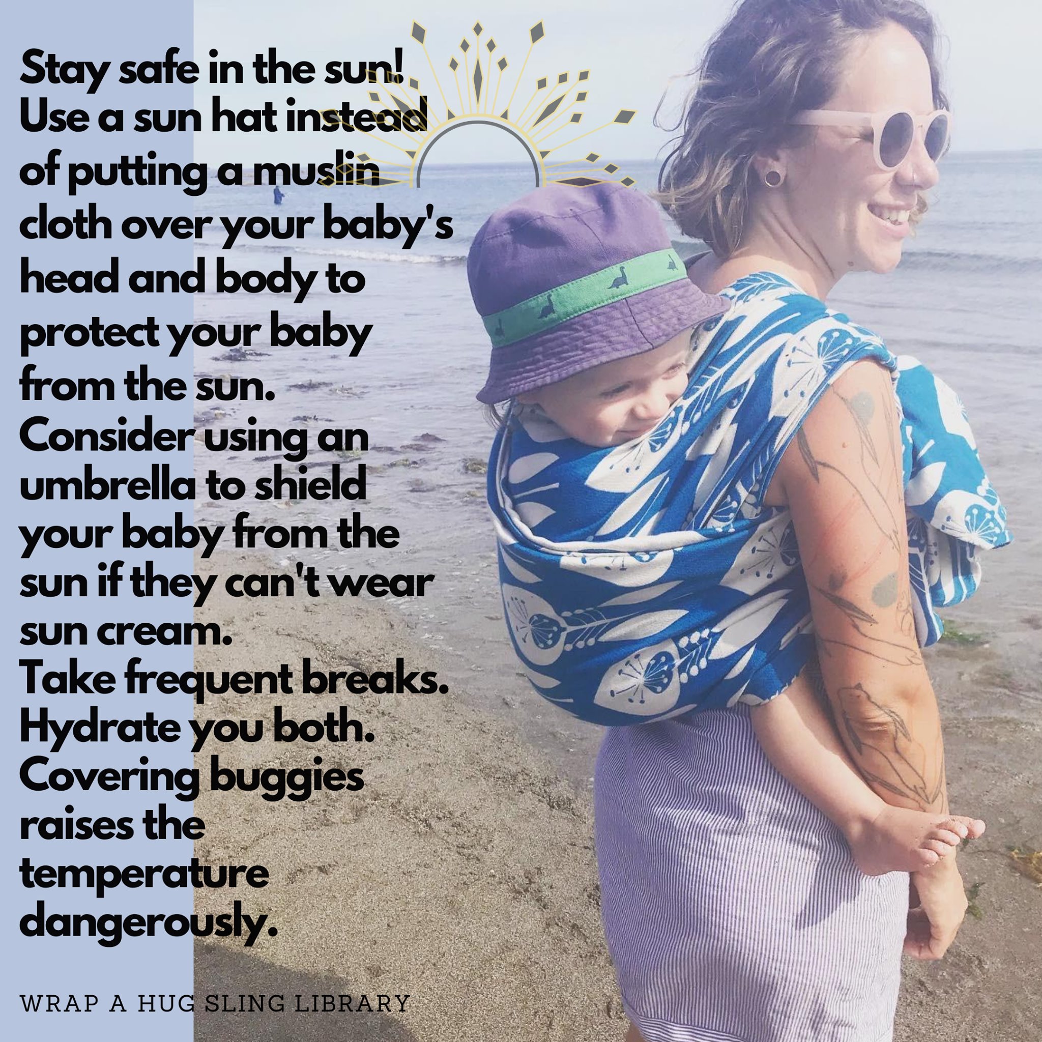 ๐NO coverings: don’t cover your sling with a muslin cloth or anything else to protect your baby from the sun. Use an umbrella/wear a large sun hat/stay in the shade. Same goes with buggies. Do not cover your buggy. Studies have show that the temperature can rise up to 7 degrees when buggies are covered which is very dangerous.