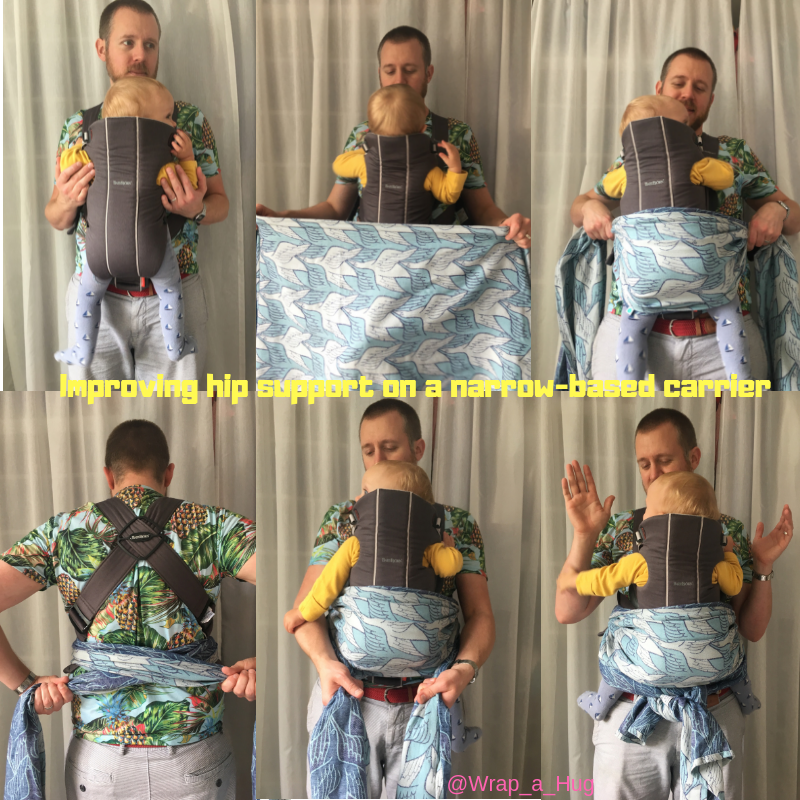 Ensure the carrier always supports your baby from knee-to-knee, all the way to the neck, this helps support their weight better. If you have a narrow-based carrier and your baby’s legs are quite straight, try the scarf trick as demo-ed in my video or see below for narrow-based carrier and stretchy wrap improvements