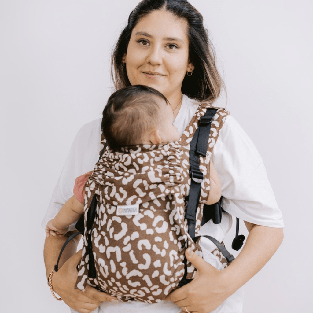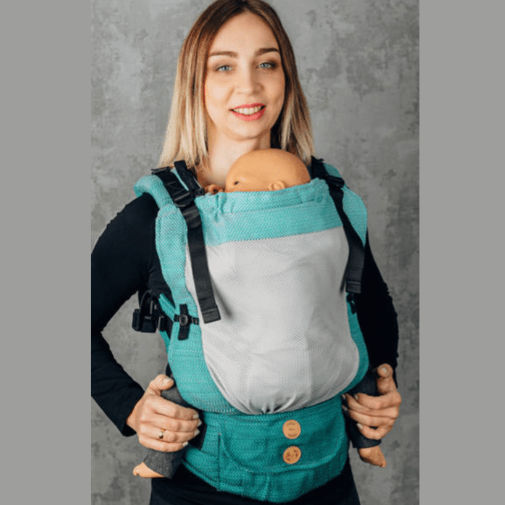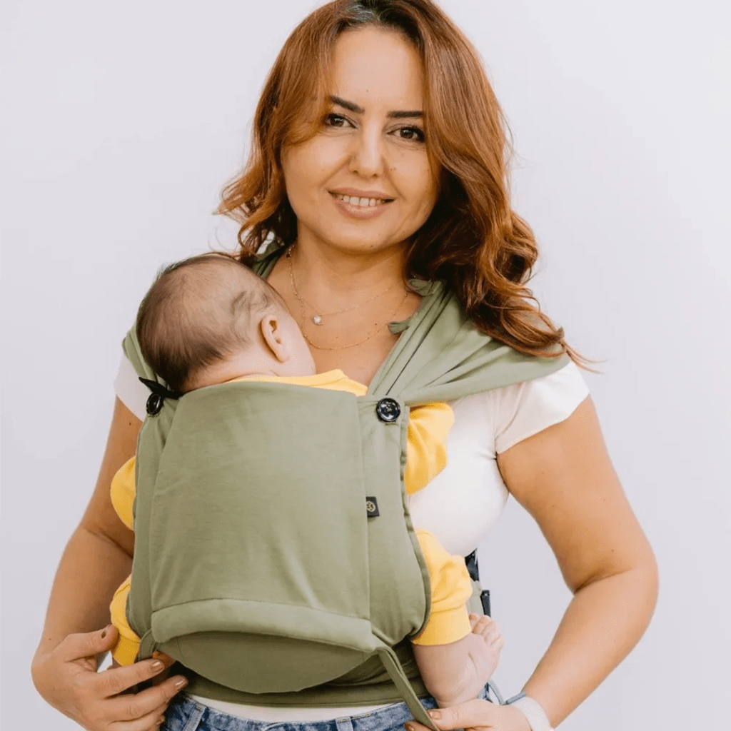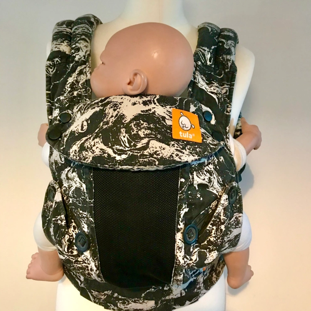 Other: designed for small babies, hybrid carrier made with stretchy wrap fabric, bands on shoulder straps to keep fabric away from the face