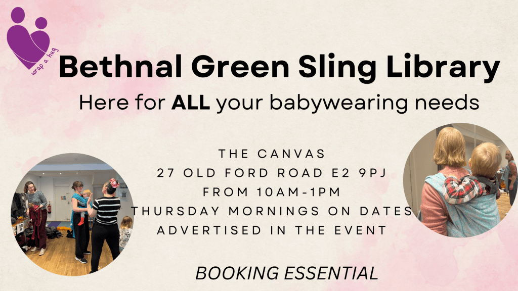There is space for buggies. We run the workshops and sling library sessions at The Canvas, 27 Old Ford road E2 9PJ. Make sure you come to this address and NOT where Wrap a Hug sling library shows up on Google maps, which is my home address. We will not be able to see latecomers if you go to the wrong address.